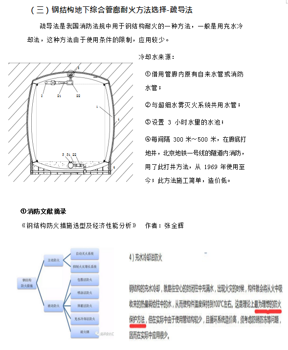 ⑨ 應對耐火極限三小時的方式是涂耐火涂料,但耐火涂料壽命只有 10~20 年, 并且不能長期耐潮,在壽命到期失效后重新涂刷時,由于內部管線及設施的存在, 清除殘余失效涂層的工作量大,涂刷新涂層更繁雜,費用較初次施工時大大增加, 并且在管廊整個壽命周期內要多次更換防火涂層;更為重要的是,耐火涂料只能阻止火災時鋼結構的溫度不高于 550℃,但對于鋼結構地下管廊來說情況特殊,在火災發生半小時左右,耐火涂料覆蓋的鋼結構體溫度就超過 150℃,廊體外部土壤中的水份形成高溫高壓蒸汽,其產生的次生災害有可能嚴重于火災本身。